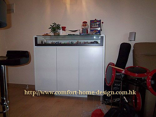 廳區舖設仿真度及防滑度高的木紋地磚,既美觀又易於打理。設計師把光管安置放於櫃頂上營造燈槽的效果,十分划算。又設計師設置地台和及頂櫃作儲物用途。為減少壓迫感,廳中的厚身大櫃頂部以灰鏡點綴,並以燈槽效果締造懸浮效果 主人房的布置以簡約為主,床頭置燈槽以達至柔道的燈光效果。屋主要求把地台睡床造高一點,高度與窗台相同,設計師遂以燈光締造層次感。孩子房以橙黃色營造活力充沛的氣息。度身訂造的高架床設計美觀而實用,不但具有母子床功能,還有不少儲物空間。